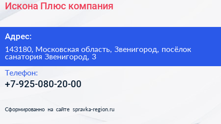 Искона Плюс, компания по адресу 143180, Московская область, Звенигород, посёлок санатория Звенигород, 3 в дальнейшем Организация, размещена в следующих категориях: