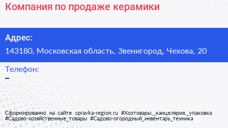 Компания по продаже керамики по адресу 143180, Московская область, Звенигород, Чехова, 20 в дальнейшем Организация, размещена в следующих категориях: