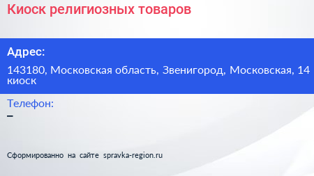 Киоск религиозных товаров по адресу 143180, Московская область, Звенигород, Московская, 14 киоск в дальнейшем Организация, размещена в следующих категориях: