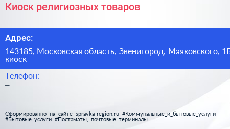 Киоск религиозных товаров по адресу 143185, Московская область, Звенигород, Маяковского, 1Б киоск в дальнейшем Организация, размещена в следующих категориях: