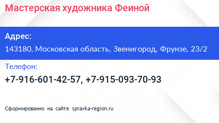 Мастерская художника Феиной по адресу 143180, Московская область, Звенигород, Фрунзе, 23/2 в дальнейшем Организация, размещена в следующих категориях: