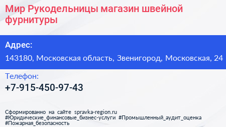 Мир Рукодельницы, магазин швейной фурнитуры по адресу 143180, Московская область, Звенигород, Московская, 24 в дальнейшем Организация, размещена в следующих категориях: