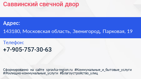 Саввинский свечной двор по адресу 143180, Московская область, Звенигород, Парковая, 19 в дальнейшем Организация, размещена в следующих категориях: