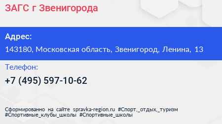 ЗАГС г. Звенигорода по адресу 143180, Московская область, Звенигород, Ленина, 13 в дальнейшем Организация, размещена в следующих категориях: