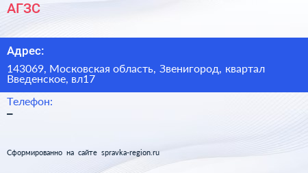 АГЗС по адресу 143069, Московская область, Звенигород, квартал Введенское, вл17 в дальнейшем Организация, размещена в следующих категориях: