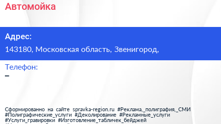 Автомойка по адресу 143180, Московская область, Звенигород, в дальнейшем Организация, размещена в следующих категориях: