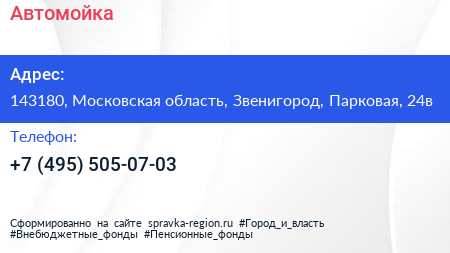 Автомойка по адресу 143180, Московская область, Звенигород, Парковая, 24в в дальнейшем Организация, размещена в следующих категориях:
