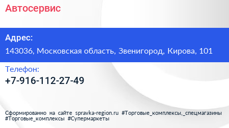 Автосервис по адресу 143036, Московская область, Звенигород, Кирова, 101 в дальнейшем Организация, размещена в следующих категориях: