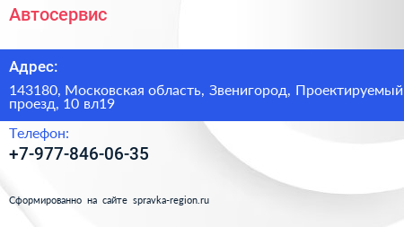 Автосервис по адресу 143180, Московская область, Звенигород, Проектируемый проезд, 10 вл19 в дальнейшем Организация, размещена в следующих категориях:
