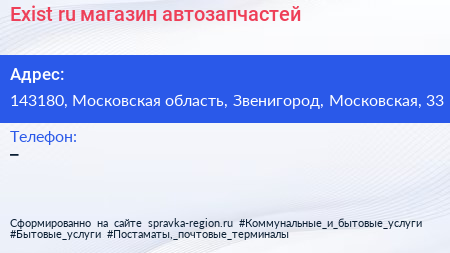 Exist.ru, магазин автозапчастей по адресу 143180, Московская область, Звенигород, Московская, 33 в дальнейшем Организация, размещена в следующих категориях: