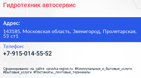 Гидротехник, автосервис по адресу 143185, Московская область, Звенигород, Пролетарская, 53 ст1 в дальнейшем Организация, размещена в следующих категориях: