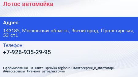 Лотос, автомойка по адресу 143185, Московская область, Звенигород, Пролетарская, 53 ст1 в дальнейшем Организация, размещена в следующих категориях: