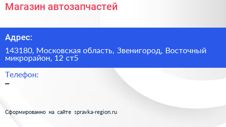 Магазин автозапчастей по адресу 143180, Московская область, Звенигород, Восточный микрорайон, 12 ст5 в дальнейшем Организация, размещена в следующих категориях: