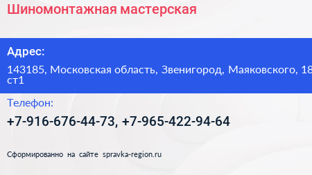 Шиномонтажная мастерская по адресу 143185, Московская область, Звенигород, Маяковского, 18 ст1 в дальнейшем Организация, размещена в следующих категориях: