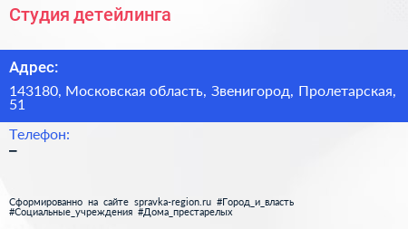 Студия детейлинга по адресу 143180, Московская область, Звенигород, Пролетарская, 51 в дальнейшем Организация, размещена в следующих категориях: