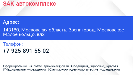 ЗАК, автокомплекс по адресу 143180, Московская область, Звенигород, Московское Малое кольцо, вл2 в дальнейшем Организация, размещена в следующих категориях: