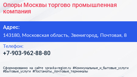 Опоры Москвы, торгово-промышленная компания по адресу 143180, Московская область, Звенигород, Почтовая, 8 в дальнейшем Организация, размещена в следующих категориях: