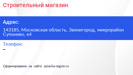 Строительный магазин по адресу 143185, Московская область, Звенигород, микрорайон Супонево, к4 в дальнейшем Организация, размещена в следующих категориях: