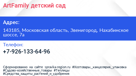 ArtFamily, детский сад по адресу 143185, Московская область, Звенигород, Нахабинское шоссе, 7а в дальнейшем Организация, размещена в следующих категориях: