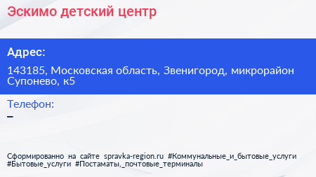 Эскимо, детский центр по адресу 143185, Московская область, Звенигород, микрорайон Супонево, к5 в дальнейшем Организация, размещена в следующих категориях: