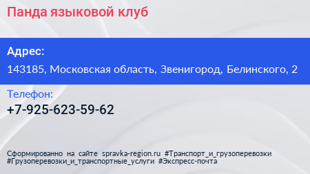 Панда, языковой клуб по адресу 143185, Московская область, Звенигород, Белинского, 2 в дальнейшем Организация, размещена в следующих категориях:
