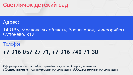 Светлячок, детский сад по адресу 143185, Московская область, Звенигород, микрорайон Супонево, к12 в дальнейшем Организация, размещена в следующих категориях: