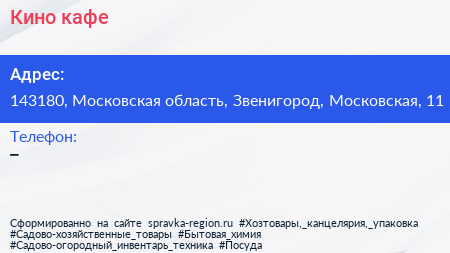 Кино, кафе по адресу 143180, Московская область, Звенигород, Московская, 11 в дальнейшем Организация, размещена в следующих категориях: