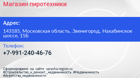 Магазин пиротехники по адресу 143185, Московская область, Звенигород, Нахабинское шоссе, 15Б в дальнейшем Организация, размещена в следующих категориях: