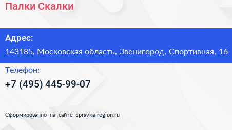 Палки-Скалки по адресу 143185, Московская область, Звенигород, Спортивная, 16 в дальнейшем Организация, размещена в следующих категориях: