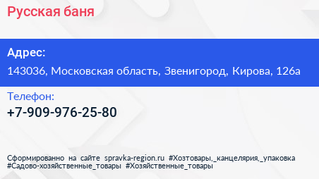 Русская баня по адресу 143036, Московская область, Звенигород, Кирова, 126а в дальнейшем Организация, размещена в следующих категориях: