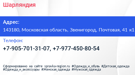 Шарляндия по адресу 143180, Московская область, Звенигород, Почтовая, 41 к1 в дальнейшем Организация, размещена в следующих категориях: