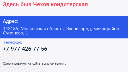 Здесь был Чехов, кондитерская по адресу 143185, Московская область, Звенигород, микрорайон Супонево, 1 в дальнейшем Организация, размещена в следующих категориях: