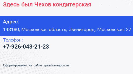 Здесь был Чехов, кондитерская по адресу 143180, Московская область, Звенигород, Московская, 27 в дальнейшем Организация, размещена в следующих категориях: