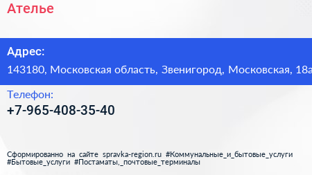 Ателье по адресу 143180, Московская область, Звенигород, Московская, 18а в дальнейшем Организация, размещена в следующих категориях: