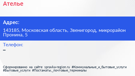 Ателье по адресу 143185, Московская область, Звенигород, микрорайон Пронина, 5 в дальнейшем Организация, размещена в следующих категориях: