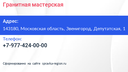 Гранитная мастерская по адресу 143180, Московская область, Звенигород, Депутатская, 1 в дальнейшем Организация, размещена в следующих категориях: