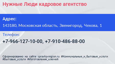 Нужные Люди, кадровое агентство по адресу 143180, Московская область, Звенигород, Чехова, 1 в дальнейшем Организация, размещена в следующих категориях: