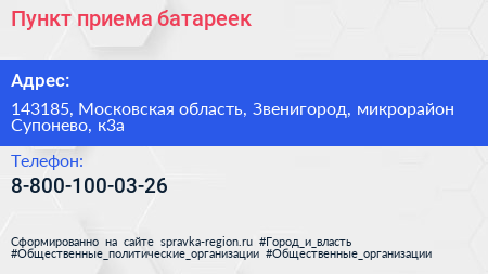 Пункт приема батареек по адресу 143185, Московская область, Звенигород, микрорайон Супонево, к3а в дальнейшем Организация, размещена в следующих категориях: