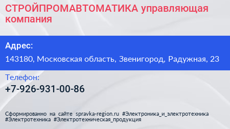 СТРОЙПРОМАВТОМАТИКА, управляющая компания по адресу 143180, Московская область, Звенигород, Радужная, 23 в дальнейшем Организация, размещена в следующих категориях: