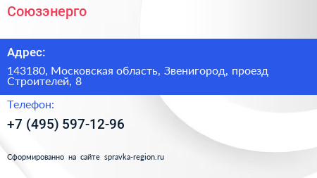 Союзэнерго по адресу 143180, Московская область, Звенигород, проезд Строителей, 8 в дальнейшем Организация, размещена в следующих категориях: