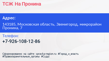 ТСЖ На Пронина по адресу 143185, Московская область, Звенигород, микрорайон Пронина, 7 в дальнейшем Организация, размещена в следующих категориях: