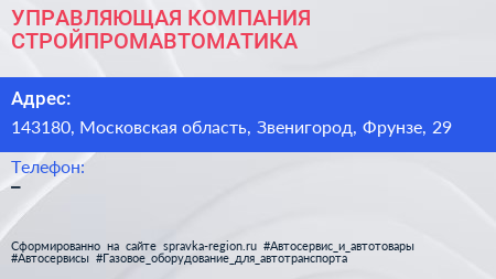 УПРАВЛЯЮЩАЯ КОМПАНИЯ-СТРОЙПРОМАВТОМАТИКА по адресу 143180, Московская область, Звенигород, Фрунзе, 29 в дальнейшем Организация, размещена в следующих категориях: