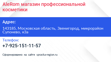 AleRom, магазин профессиональной косметики по адресу 143185, Московская область, Звенигород, микрорайон Супонево, к3а в дальнейшем Организация, размещена в следующих категориях: