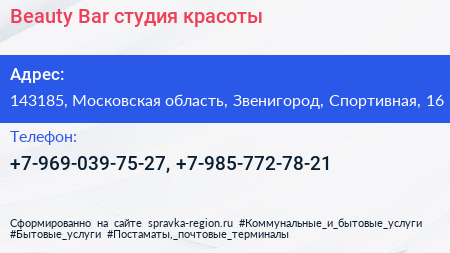 Beauty Bar, студия красоты по адресу 143185, Московская область, Звенигород, Спортивная, 16 в дальнейшем Организация, размещена в следующих категориях: