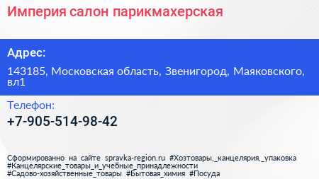 Империя, салон-парикмахерская по адресу 143185, Московская область, Звенигород, Маяковского, вл1 в дальнейшем Организация, размещена в следующих категориях:
