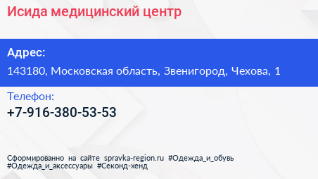 Исида, медицинский центр по адресу 143180, Московская область, Звенигород, Чехова, 1 в дальнейшем Организация, размещена в следующих категориях: