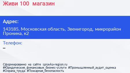 Живи 100+, магазин по адресу 143185, Московская область, Звенигород, микрорайон Пронина, к2 в дальнейшем Организация, размещена в следующих категориях: