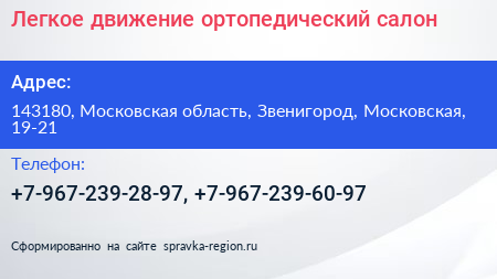 Легкое движение, ортопедический салон по адресу 143180, Московская область, Звенигород, Московская, 19-21 в дальнейшем Организация, размещена в следующих категориях: