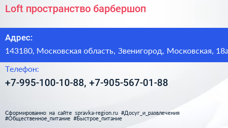 Loft пространство, барбершоп по адресу 143180, Московская область, Звенигород, Московская, 18а в дальнейшем Организация, размещена в следующих категориях:
