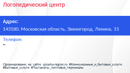 Логопедический центр по адресу 143180, Московская область, Звенигород, Ленина, 15 в дальнейшем Организация, размещена в следующих категориях: